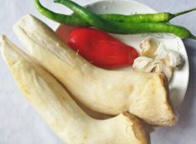 1、杏鲍菇1个,尖椒1个,红尖椒1个,油1勺,盐1勺,鸡精1勺,蚝油1勺,蒜1瓣。