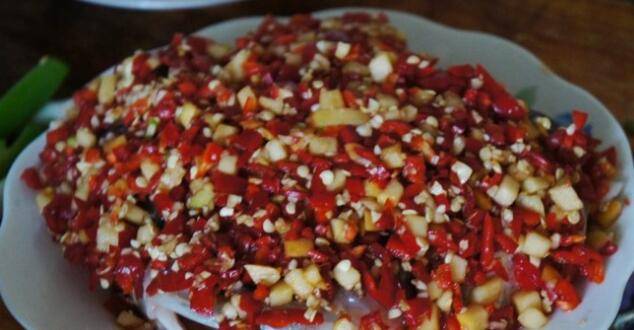 8、将腌制好的鱼头平铺在盘中,上边铺满剁椒酱,加一点蒸鱼豉油。