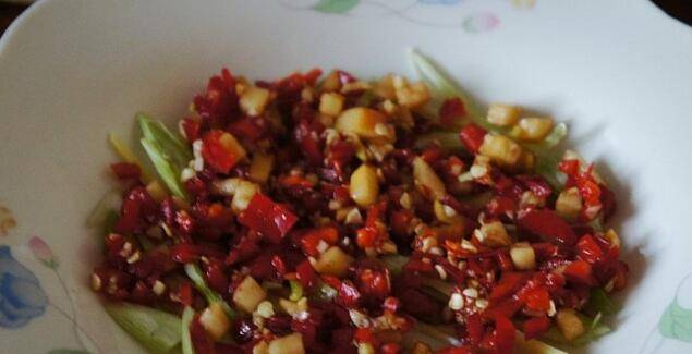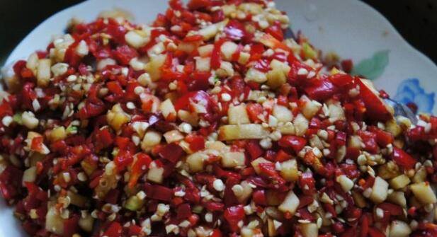 4、尖椒、大蒜切碎,切一点苹果碎。