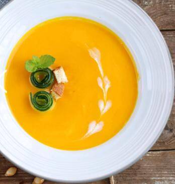 9、用勺子或筷子,在南瓜汤上滴几滴或一圈淡奶油,用牙签从奶油的中间拉开,简单的拉花完成。
