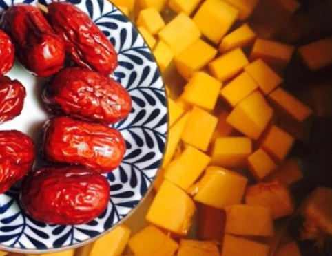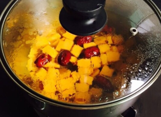 3、倒入南瓜,放入红枣。盖上锅盖大火煮五分钟转中小火煮10分钟即可。