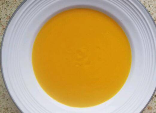 8、待奶油和南瓜糊完全融合时,关火,将南瓜汤倒入准备好的盘中,盘子轻轻震两下,让南瓜汤的表面更平整。