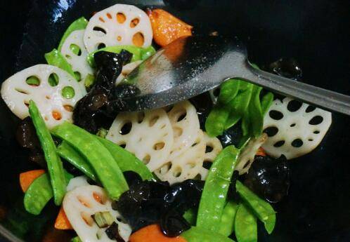 加入木耳煸炒,加入2克盐,再加入荷兰豆煸炒半分钟,倒入水淀粉。翻炒出锅。