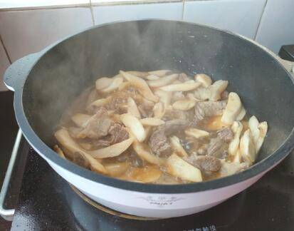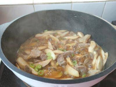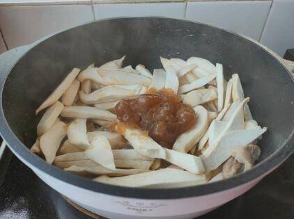 下入鸡腿菇,高汤也一并倒入锅内,再次炒匀。