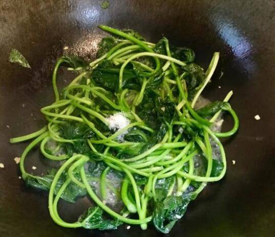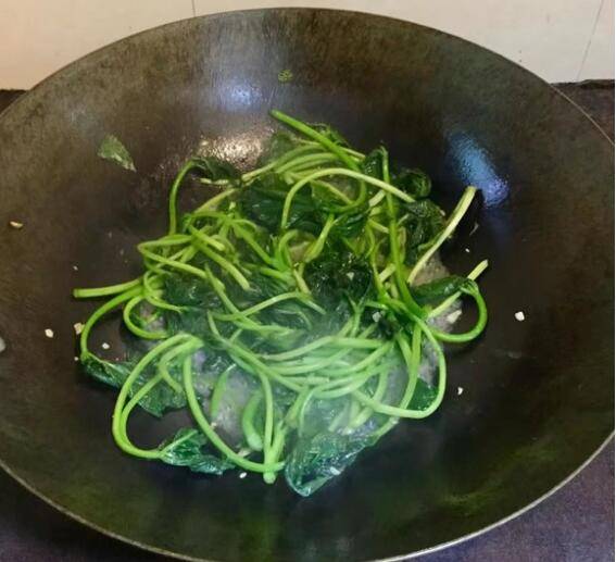 放入薯苗,翻炒至软;