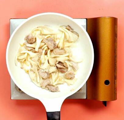 锅中放油加肉片,姜蒜,炒至变色加平菇。