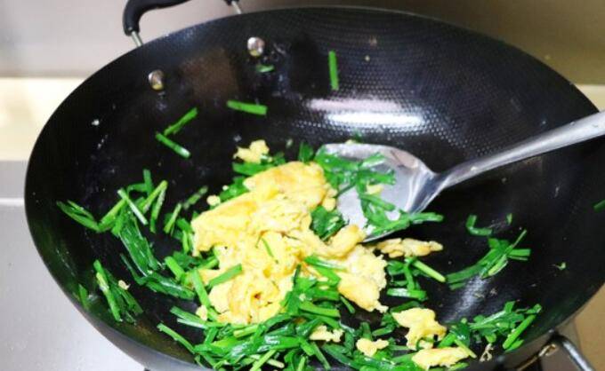 6.鸡蛋炒好后,倒入韭菜,翻炒均匀。