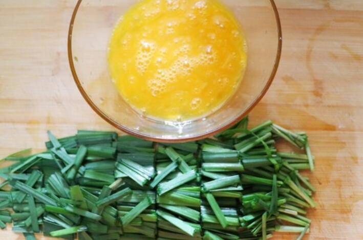 3.韭菜切段,鸡蛋加盐打散。