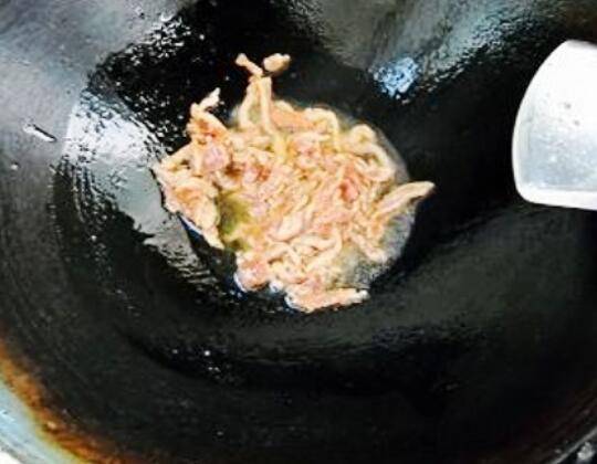 锅中油热,滑散肉丝;盛起备用。
