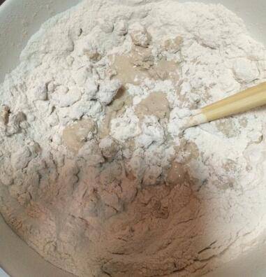 4、将拌匀的山芋粉液倒入锅中,用锅铲翻动、压捻、搅匀。