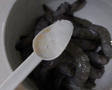 基围虾择洗干净,剥壳留尾,放入碗中,加入适量的食盐腌制一下。
