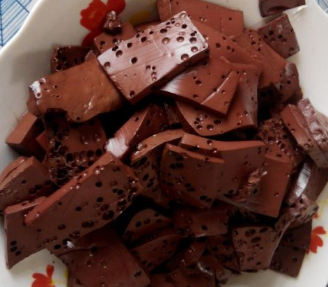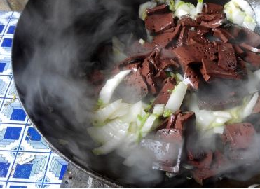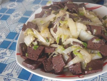 准备食材:血豆腐、油、葱、辣椒、白菜、味精。