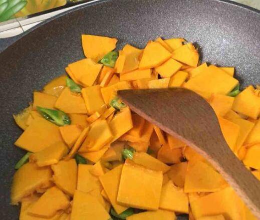 2、倒入切好的南瓜翻炒一分钟后,加入盐、鸡精、蚝油继续翻炒。