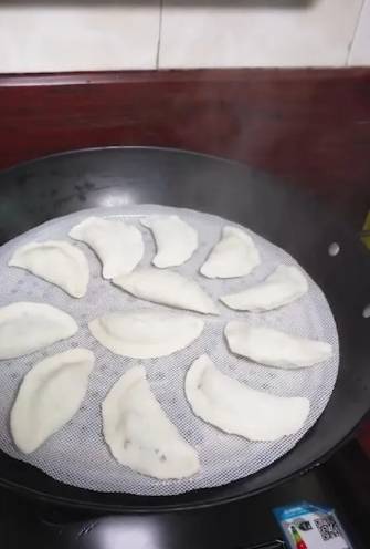 4、用饺子皮把炒熟的配料对折包成半月型锁好边。锅里烧水,水开后把包好的冬节鸽下锅蒸10分钟即可食用。