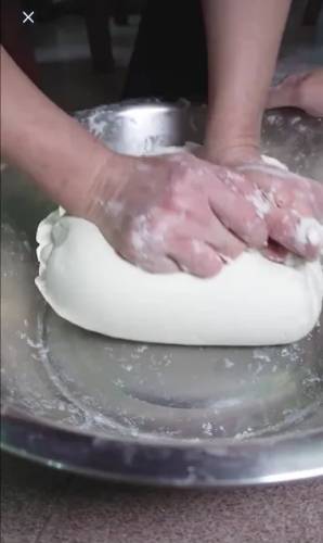 3、一斤糯米粉加入一斤粘粉拌匀,加入适量70度左右的热水搅拌均匀,揉成面团,再擀成饺子皮。