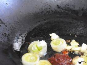 锅里倒入油,放入花椒、八角、郫县豆瓣酱、葱、姜、蒜炒出红油。