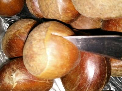 2、在栗子鼓起的一面用小刀尖垂直压上口子,将栗子皮剪开。