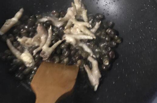 鸡爪先下锅翻炒两分钟,螺丝下锅跟鸡爪一起翻炒,加料酒翻炒,依次放入生姜大蒜辣椒接着翻炒。生抽,酱油,醋放入翻炒,待鸡爪变色加入盐鸡精加水炖5分钟。