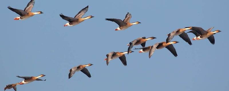 3、大雁是雁属鸟类的通称,共同特点是体形较大,喙的基部较高,长度和头部的长度几乎相等,上颌的边缘有强大的齿突,上颌硬角质鞘强大,占了上颌的全部。额部无肉瘤,呈流线型。颈部较粗短,翅膀长而尖,尾羽一般为16~18枚。体羽大多为褐色、灰色或白色。
