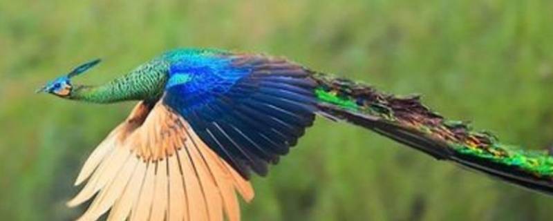 绿孔雀。绿孔雀也叫爪哇孔雀、龙鸟,是孔雀属两种孔雀之一,另一种是蓝孔雀。绿孔雀包括三个亚种。绿孔雀的羽毛颜色鲜艳,可以起到保护色的作用,大多数捕食者,例如虎、豹、野狗、猫头鹰、鹰等都没有辨色能力。