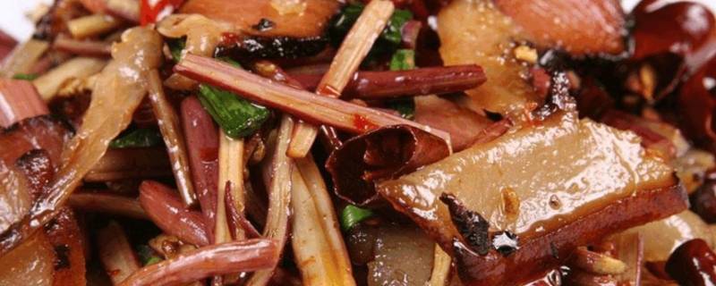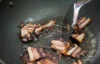 2、生姜爆香后倒入腊肉煸炒。
