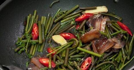 用料:春菜200克、腊肉130克、红尖椒1个、白糖1汤匙、姜1小块。