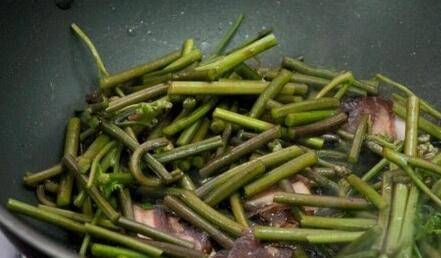 3、腊肉煸炒致肥肉半透明时倒入春菜煸炒,并放入适量白糖。