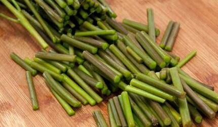 1、春菜洗净切段,腊肉切片,红尖椒切片。
