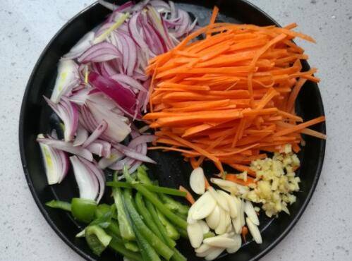 1、胡萝卜切丝,洋葱洗净切丝,青椒切丝,姜末、蒜片。