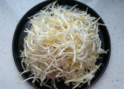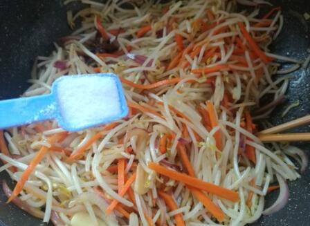 4、放绿豆芽继续翻炒,加适量盐炒匀。