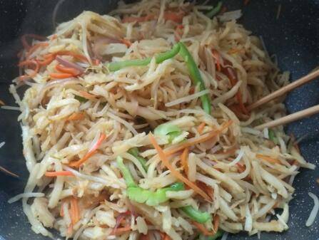 用料:饼丝500克、洋葱1个、胡萝卜半个、青椒半个、绿豆芽200克、盐适量、葱蒜适量、生抽2勺、食用油适量。