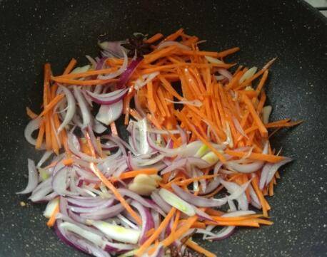 3、炒锅烧热倒油,放洋葱炒出香味,放胡萝卜丝煸炒均匀。