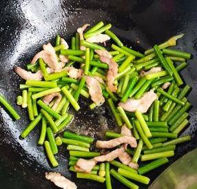 4、待肉焦黄,蒜毫表皮较皱时即可将其盛出。
