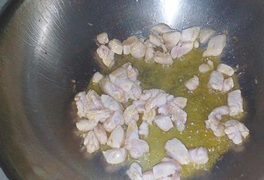 锅中留少许底油,倒入鸡丁煸炒;