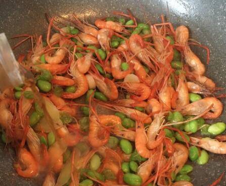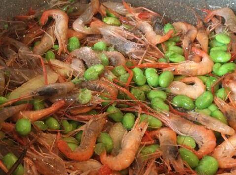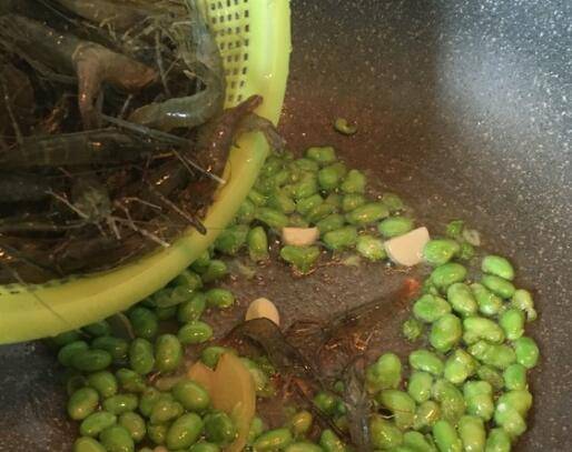 用料:河虾400克、毛豆100克、生姜3片、大蒜2瓣、料酒50毫升、盐3克。