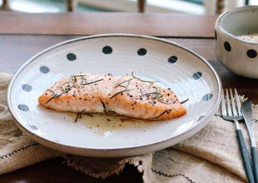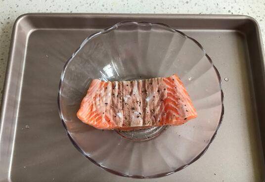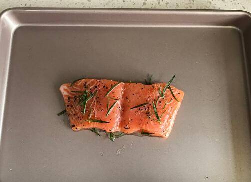 用料:三文鱼柳一块、海盐适量、黑胡椒适量、郎姆酒5克、橄榄油5克、迷迭香适量。