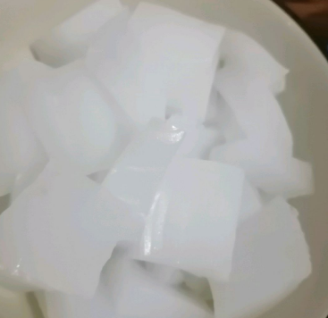 凉粉切块备用,生抽、醋、盐、白糖、鸡精搅拌均匀。