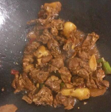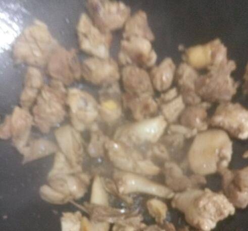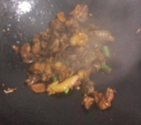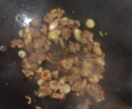9、加入青蒜杆炒一会,待锅内有点焦锅时加开水。