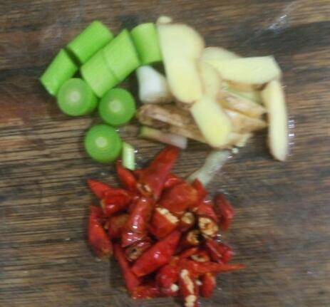 1、先把姜切片,蒜切段,干辣椒切碎备用。