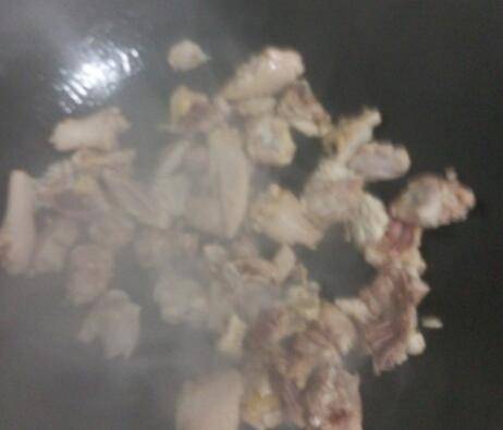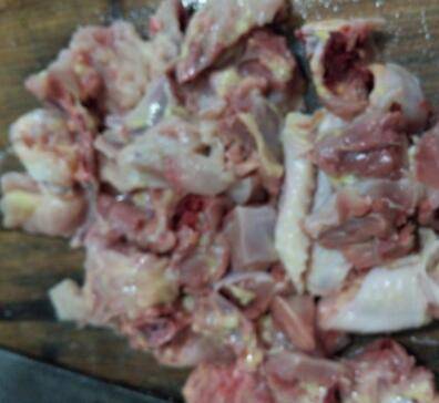 2、半边鸡用小刀去皮,割下肥油,然后切成小块。