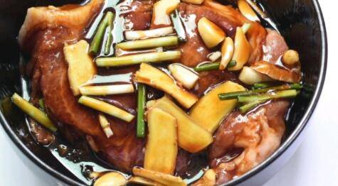 梅头肉500克、蒜头3颗、姜一块、糖4大勺、盐1勺、现磨黑胡椒1克、生抽4大勺、料酒3大勺、蚝油2大勺、蜂蜜3大勺。