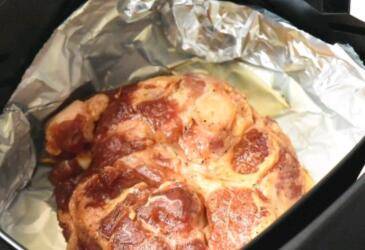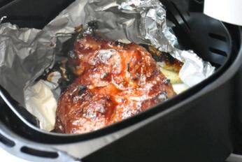设置200度烤35分钟,烘烤15分钟时,拖出炸篮,翻面,将第4步中的蜜汁给肉刷一层,炸篮推回继续烤。