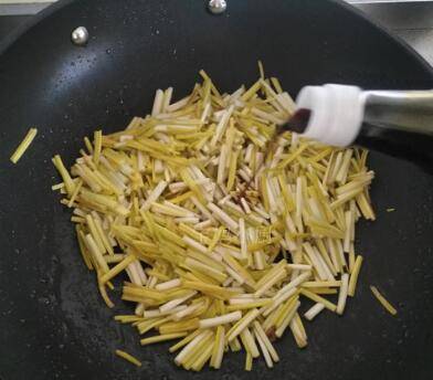 利用锅内的余油,放入蒜黄,加一点酱油提色。