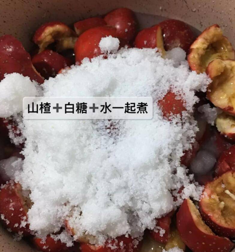 2、然后将山楂、白糖和水一起倒入锅中煮。