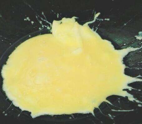 锅烧七成热,放适量花生油,油热后,把蛋液再搅拌一下,再快速倒进锅里,然后转动锅,让蛋液快速凝固。