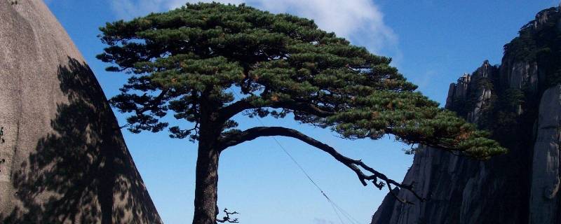 迎客松的特点是一侧枝桠伸出,如伸出一只臂膀欢迎远道而来的客人,另一只手优雅地斜插在裤兜里,雍容大度,姿态优美。迎客松在黄山玉屏楼左侧、文殊洞之上,倚青狮石破石而生,高10米,胸径0.64米,地径75厘米,枝下高2.5米,树龄至少已有800年,黄山四绝之一。