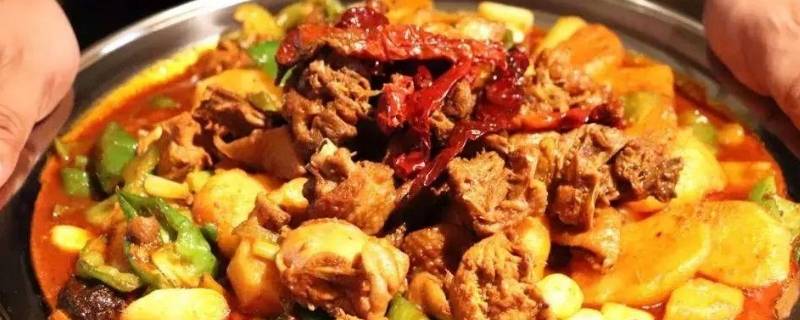 4、新疆大盘鸡:新疆大盘鸡是新疆地区名菜,大约起源于80年代末期,主要用料为鸡块和土豆块,配皮带面烹饪而成。新疆大盘鸡色彩鲜艳,有爽滑麻辣的鸡肉和软糯甜润的土豆,辣中有香,粗中带细,而且经济实惠。