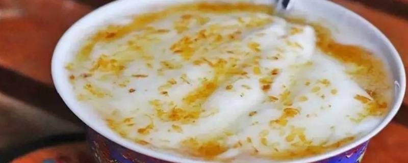 3、西藏酸奶:是用新鲜的牦牛奶,经过蒸煮、冷却、发酵而成的。制作良好的酸奶是乳白色糊状的,有时候会凝结成块,味道很酸,要加蜂蜜和糖一起吃。