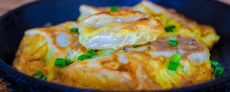 4、鸡蛋烤饺:鸡蛋烤饺也是到嵊州必点的小吃之一,制作时将蒸好的饺子整齐排列在铁锅里用文火加热,待煎至微黄时,倒入鸡蛋液,使蛋液包裹每一个饺子即可。成品色泽金黄,浓郁香脆,味道极佳。