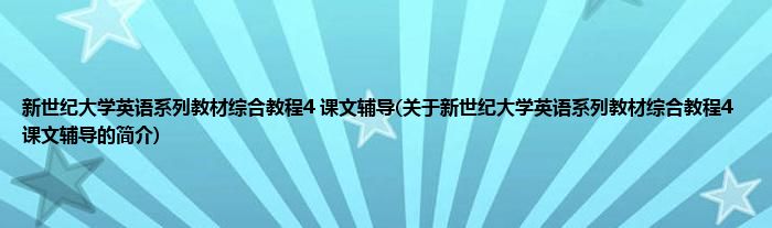 大家好,新世纪大学英语系列教材综合教程4 课文辅导,关于新世纪大学英语系列教材综合教程4 课文辅导的简介很多人还不知道,现在让我们一起来看看吧!